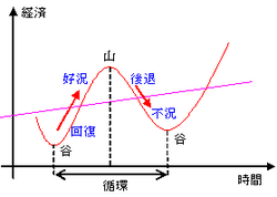 景気には波があるというのは学校で教わる常識なのですが、何故かその学校教育の時に使われるグラフは↓のピンクの線のように長期的な視点で見ると右肩上がりなグラフになってることが多いです。