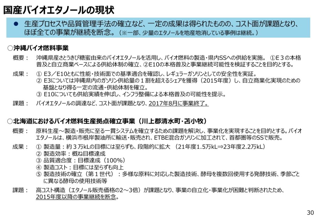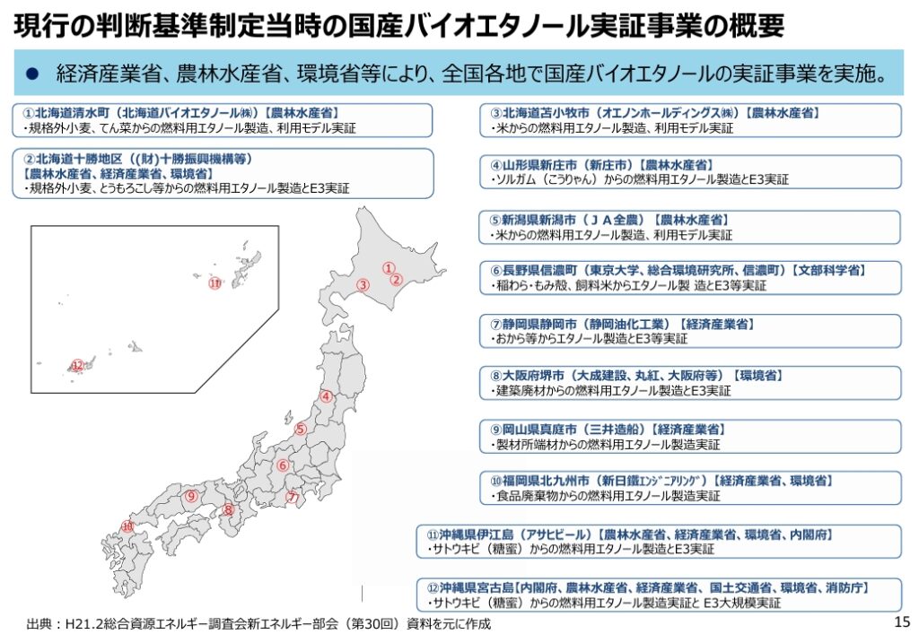 一応用語の説明をしますと、各事業の説明で所々「E3実証」という文字があるのですが、これはバイオエタノールをガソリンに3%混ぜて問題なく走行できるかの実験を指すみたいです。